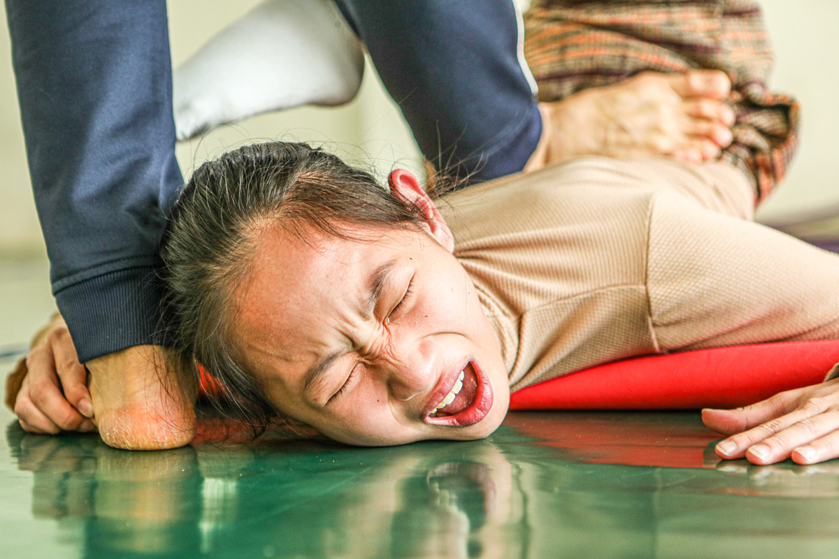 Để thực hiện động tác đứng mũi cứng hoàn hảo, các học viên còn phải nhờ người khác giẫm lên, ép cẳng chân sao cho thẳng nhất có thể.