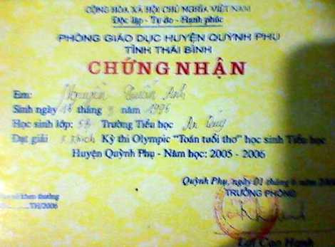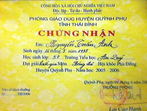| Giấy chứng nhận Tuấn Anh đạt giải Quốc gia môn bóng đá |
