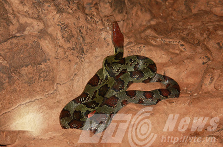 Tôi lia đèn pin trên một mỏm đá và sững người khi phát hiện một con trăn nằm cuộn tròn trong một hõm đá. Loài trăn này thật lạ, tôi chưa từng gặp bao giờ.