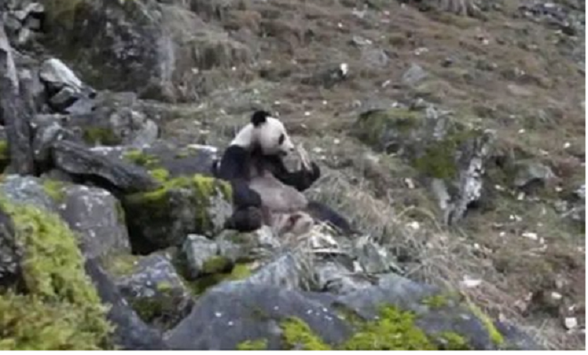 Con gấu trúc được phát hiện đang gặm thịt. (Ảnh: China News)