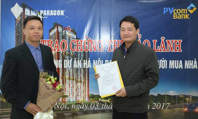 Ông Phùng Thanh Hà – Giám đốc khu vực khối khách hàng cá nhân PVcomBank trao chứng thư cho khách hàng của dự án Hanoi Paragon
