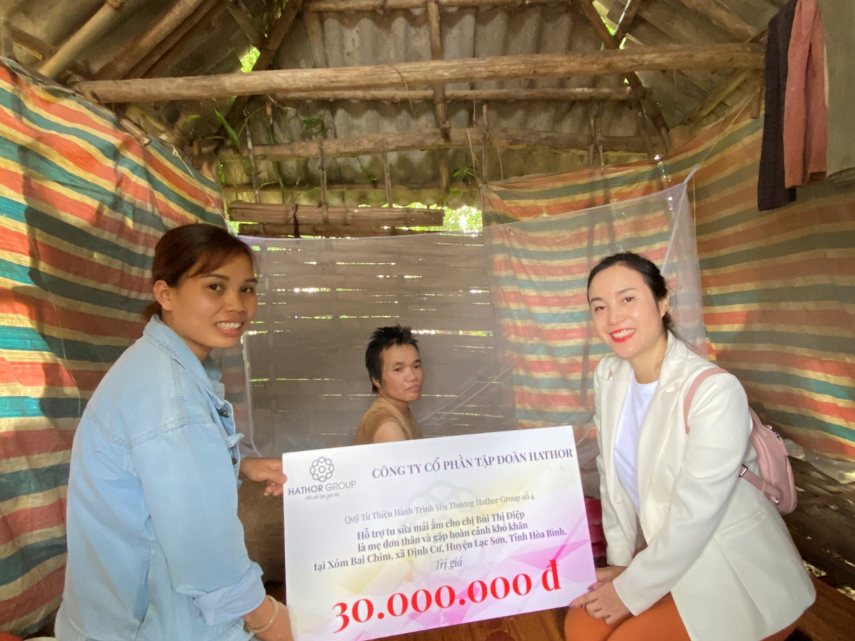 Bà Nguyễn Thị Ánh là đại diện của Hathor Group và trưởng đoàn trong chuyến đi. Hoàn cảnh lần này của hộ gia đình cần hỗ trợ là chị Bùi Thị Điệp thường trú tại xóm Bai Chim, Xã Định Cư, Huyện Lạc Sơn, Hòa Bình hiện đang gặp khó khăn và gia cảnh rất thương tâm.