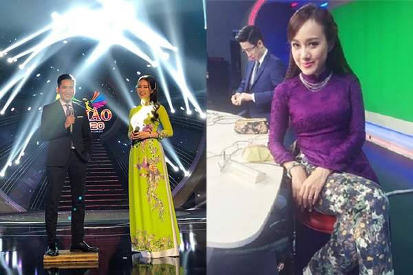 BTV Quốc Khánh phải đứng trên bục gỗ để cân xứng chiều cao với bạn dẫn Á hậu Thụy Vân.