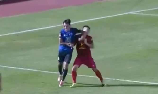 Cầu thủ CLB TP.HCM đánh cùi chỏ thẳng vào mặt đối phương.