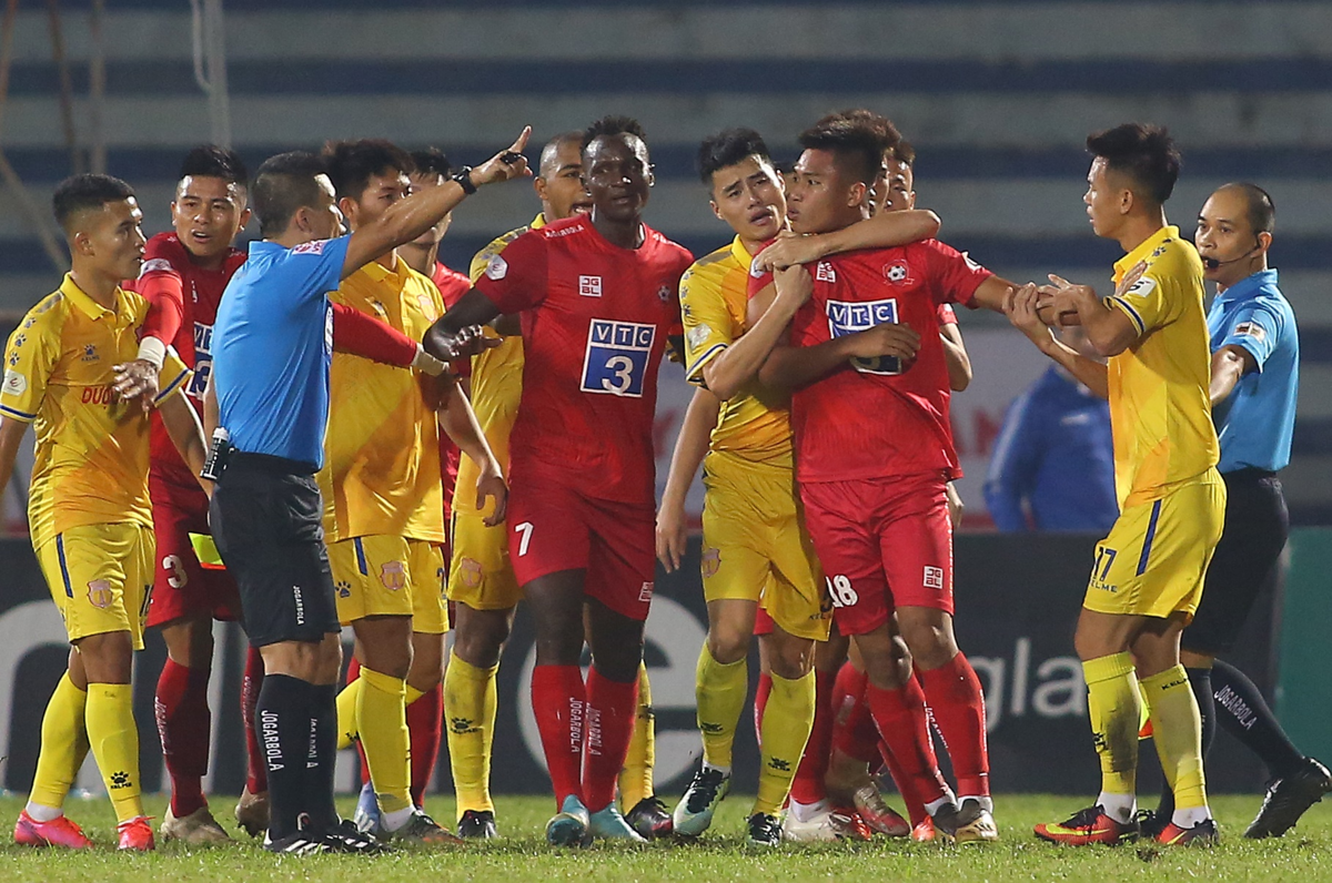 Văn Hạnh (ngoài cùng bên phải) định lao vào "tính sổ" với trọng tài chính.