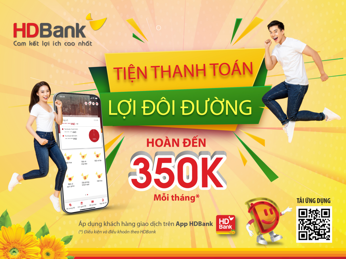 Chương trình ưu đãi “Tiện Thanh Toán - Lợi Đôi Đường Cùng App HDBank” sẽ được triển khai từ nay đến hết tháng 12 năm nay, trên toàn hệ thống. Theo đó, các khách hàng cá nhân thực hiện thành công các giao dịch nạp tiền điện thoại, thanh toán hóa đơn sinh hoạt, thanh toán QR Code sẽ nhận được quà tặng từ HDBank.