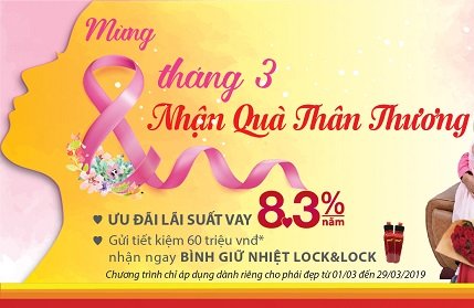 Theo đó, với tất cả giao dịch tiền vay, các nữ khách hàng sẽ được hưởng ưu đãi hấp dẫn 8,3%/ năm. Ngoài ra, khi gởi tiết kiệm từ 60 triệu đồng trong 15 tháng trở lên, chị em phụ nữ sẽ nhận ngay 01 bình giữ nhiệt Lock&Lock xinh xắn, tiện dụng. Chương trình chỉ áp dụng dành riêng cho phái đẹp từ ngày 01/03 đến hết ngày 29/03/2019, trên toàn hệ thống HDBank.