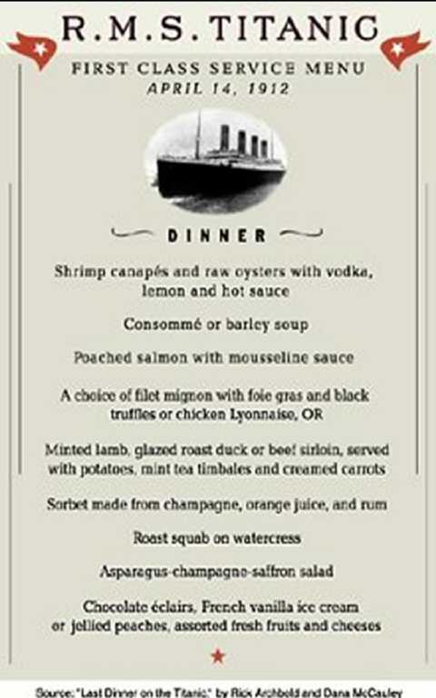 Thực khách sẽ được các bồi bàn mặc đồng phục giống như bồi bàn của Titanic phục vụ. Họ sẽ được ăn bằng đĩa làm bằng sứ và tro xương giống như thực khách Titanic.