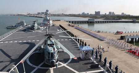 | Trực thăng đậu trên sàn tàu đổ bộ Changbaishan của Trung Quốc |