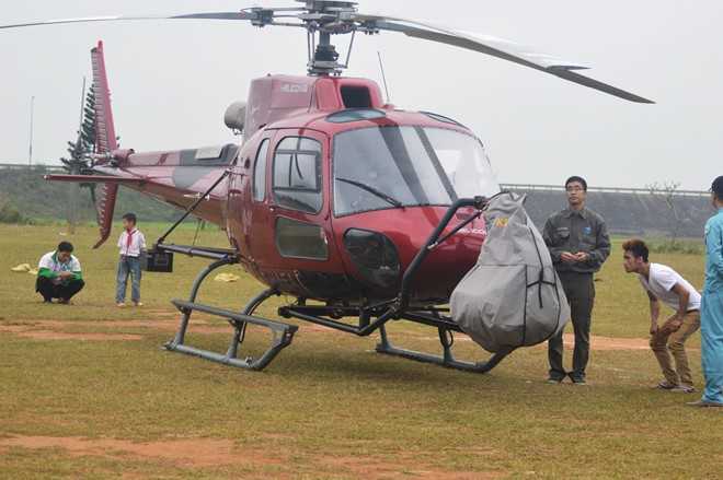 | Đoàn làm phim đã phải tạm hoãn một số cảnh quay trên không nên máy bay trực thăng được đưa về trung tâm Phong Nha. Ảnh: Văn Được. |