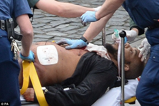 Trong bức ảnh được báo chí Anh đăng tải, nghi phạm được đặt nằm trên cáng và được hỗ trợ y tế sau khi bị cảnh sát bắn hạ.