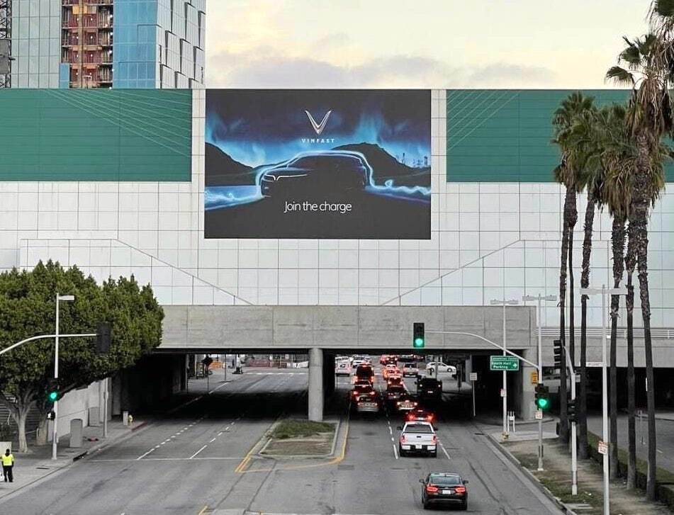 Không chỉ xuất hiện trên các tuyến phố lớn, hình ảnh quảng bá cho thương hiệu ô tô được giới truyền thông và chuyên gia quốc tế đặt nhiều kì vọng còn xuất hiện tràn ngập tại Trung tâm Triển lãm Los Angeles, ngay từ khu vực thang cuốn dẫn lên không gian trưng bày.