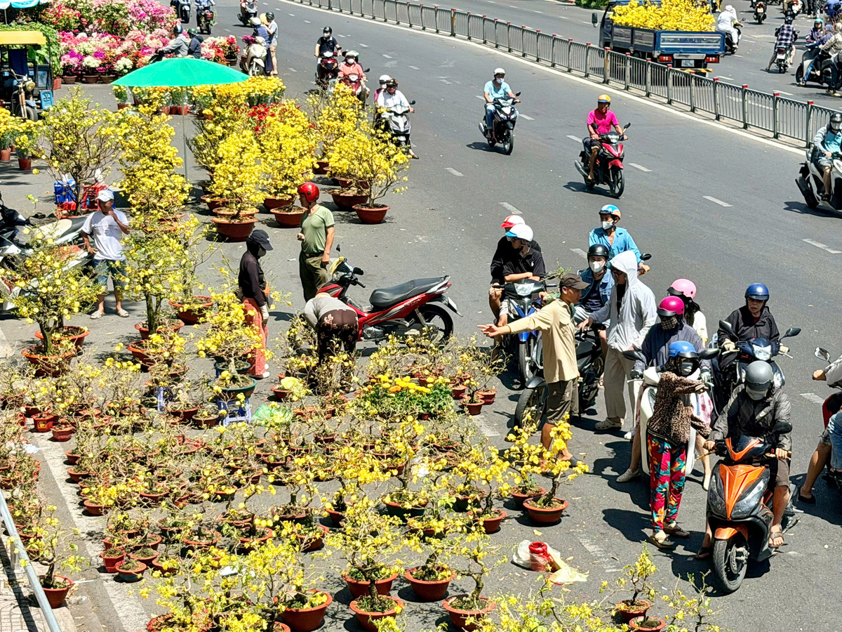 Tại chợ hoa ở công viên Làng Hoa (phường Thông Tây Hội, TP.HCM), không khí xả hàng cũng diễn ra sôi động. Nhiều tiểu thương treo biển giảm giá lớn để bán nốt số cây còn lại. Mai nhỏ trước đó bán khoảng 300.000 đồng/chậu, nay hạ xuống chỉ còn 50.000 đồng/chậu.