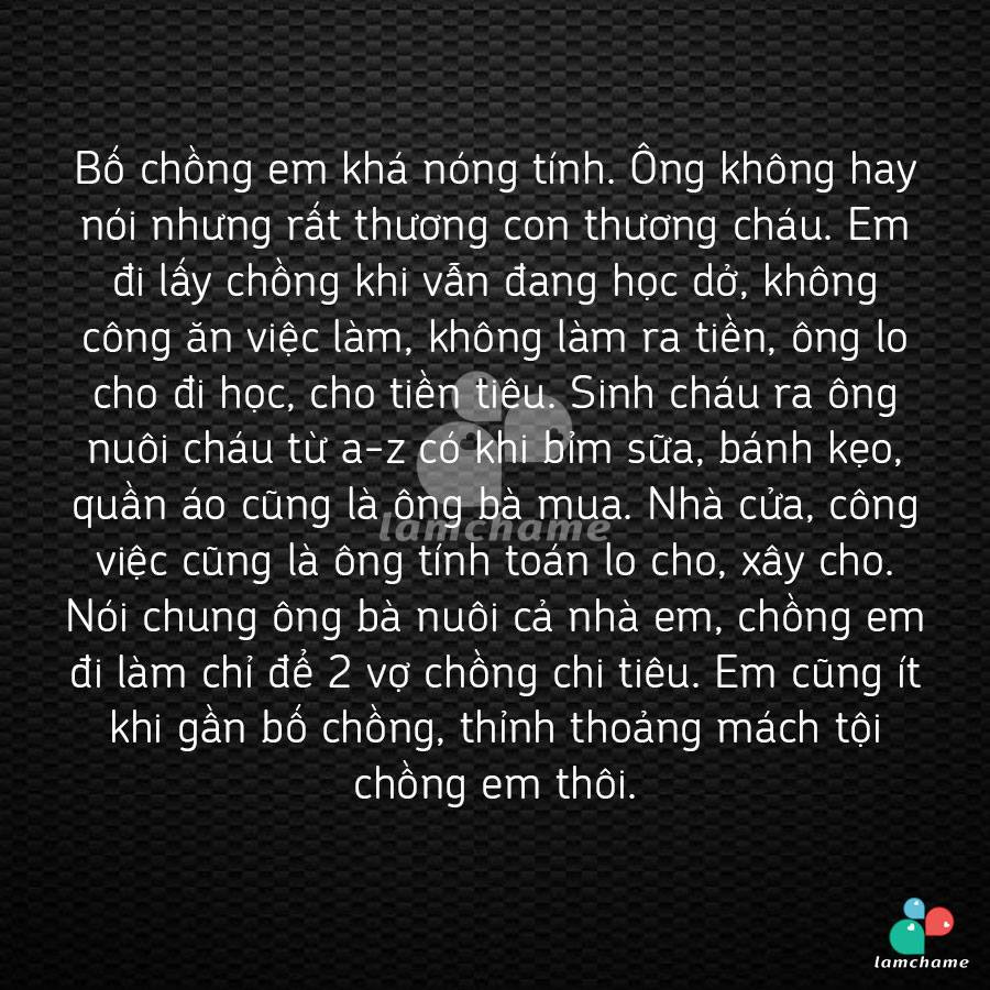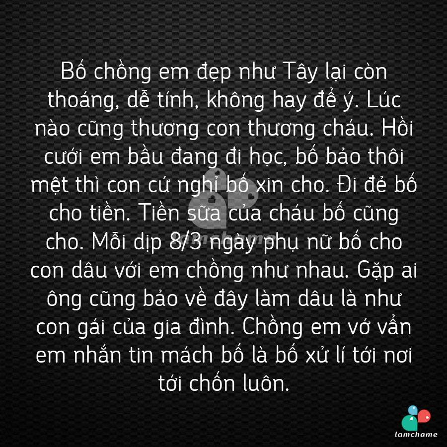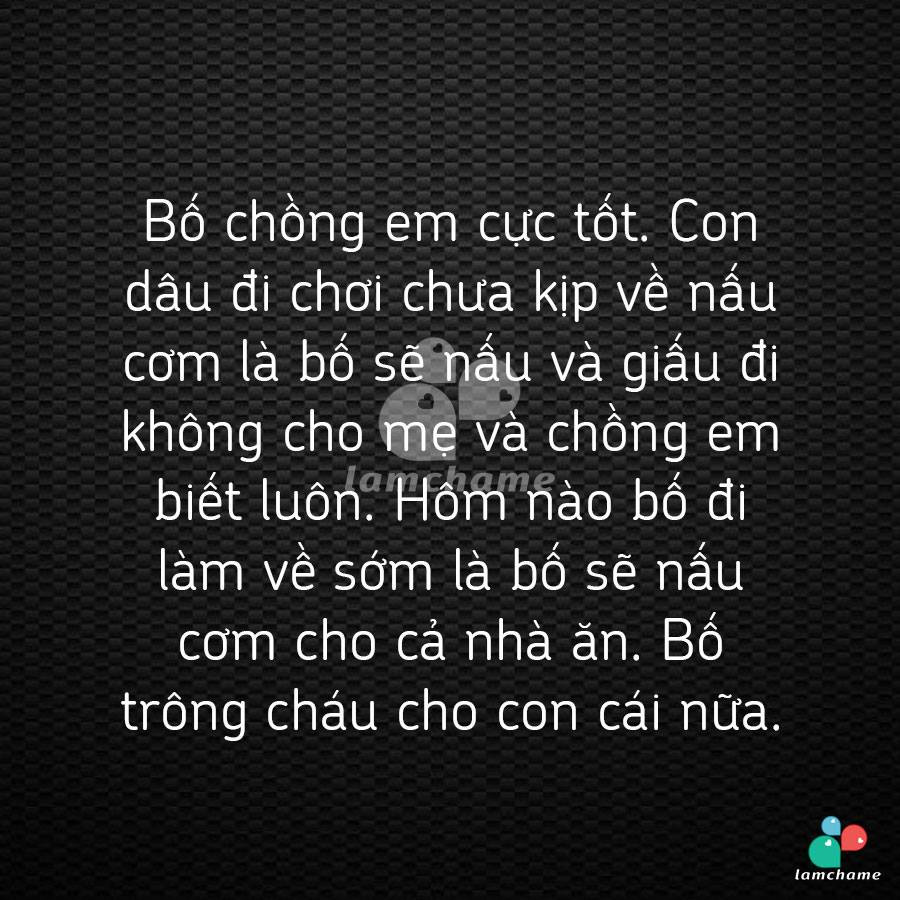 Thế mà mới đây, hội chị em Eva lại có một phen dậy sóng với chủ đề “bố chồng”. Người khởi xướng ra phong trào này là một mẹ có tên FB là L.A. Kèm theo đó là dòng ca thán: “Bố chồng các mom như thế nào? Vào chia sẻ đi ạ. Em mệt mỏi quá”.