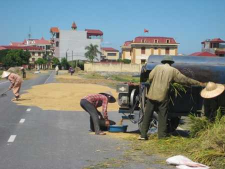 Thoát ra khỏi đám khói, một lần nữa những người tham gia giao thông phải đảo tay lái trước các chướng ngại vật là những vạt thóc phơi chiếm dụng hết gần nửa lòng đường. Mặc cho các xe ô tô khi qua đoạn đường cao tốc này phải giảm ga, "rón rén" tránh các chướng ngại vật này, người dân vẫn vô tư thực hiện các công đoạn phơi, đảo và đóng bao thóc, lúa ngay dưới lòng đường. Thậm chí nhiều hộ gia đình mang cả máy tuốt lúa ra cạnh đường quốc lộ để thu hoạch và phơi phóng… cho tiện?!.