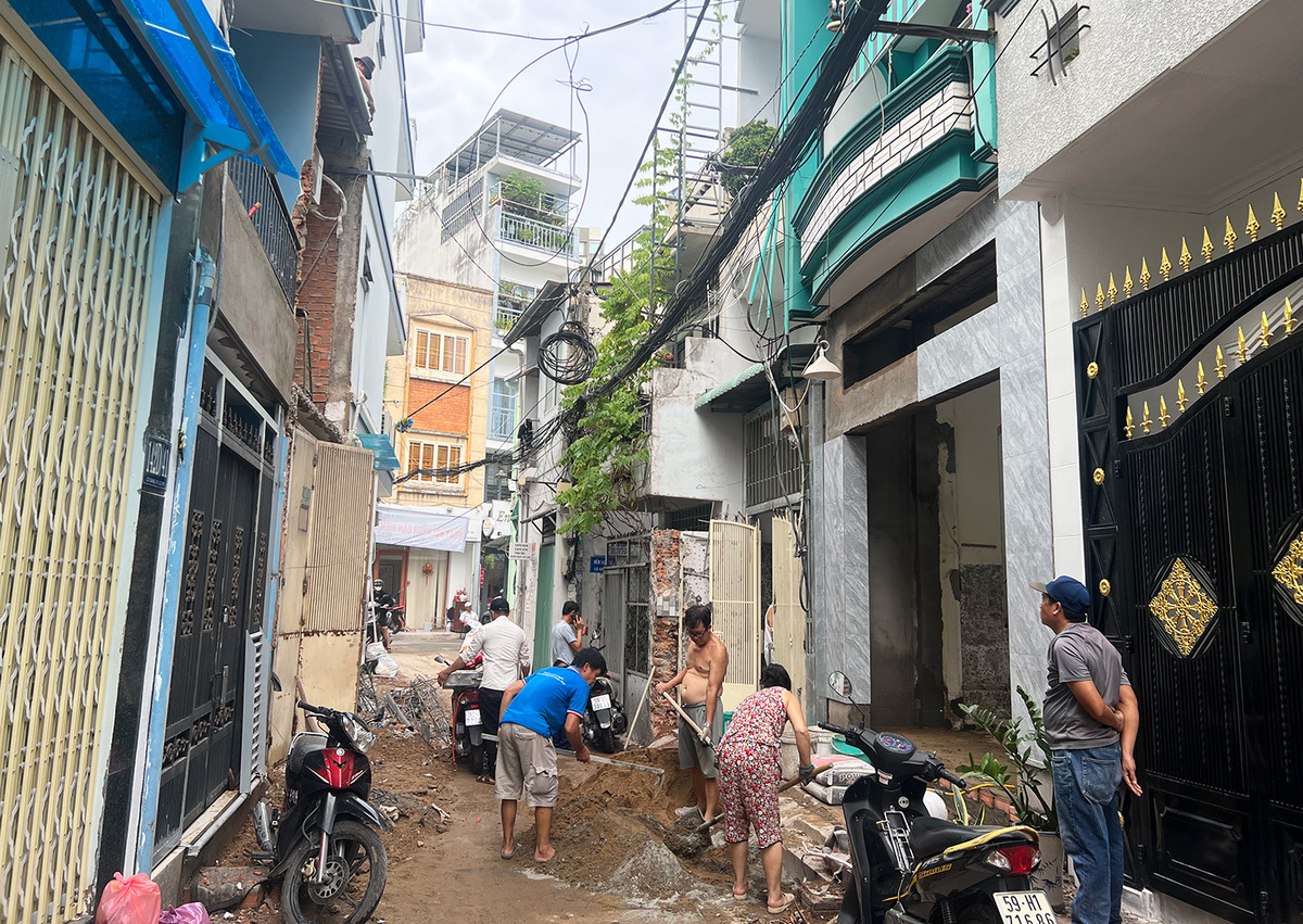 Dọc con hẻm này, nhiều ngôi nhà đang được người dân tháo dỡ, xà bần, gạch đá ngổn ngang, vật liệu thi công được tập kết xung quanh.