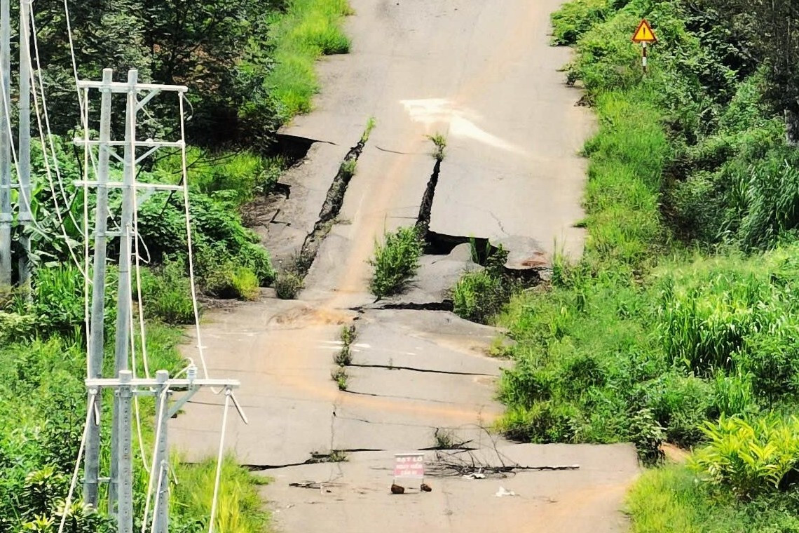 Nền đường thi công trước đó bị ảnh hưởng do mưa lớn dẫn đến sạt lở và nứt toác.