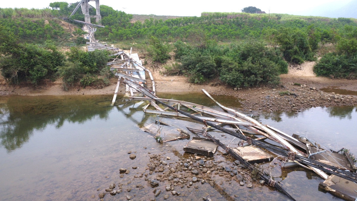 Tháp sắt và mặt cầu bị rơi xuống sông Hiếu.