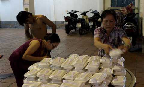 | Chuẩn bị cơm để phát cho các hộ dân có nhà bị cháy. |