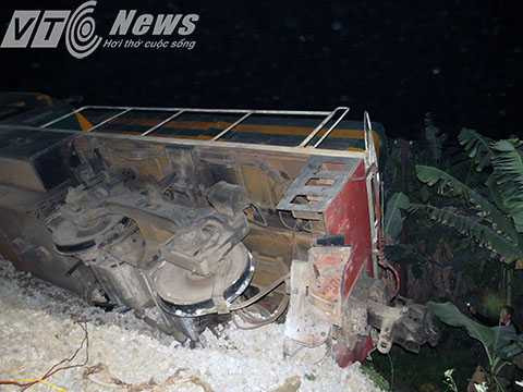 Chiếc xe container bị tông văng xa khoảng 15m, lật nghiêng trên đường, đầu máy hư hỏng nặng, dầu máy chảy lênh láng trên mặt đường