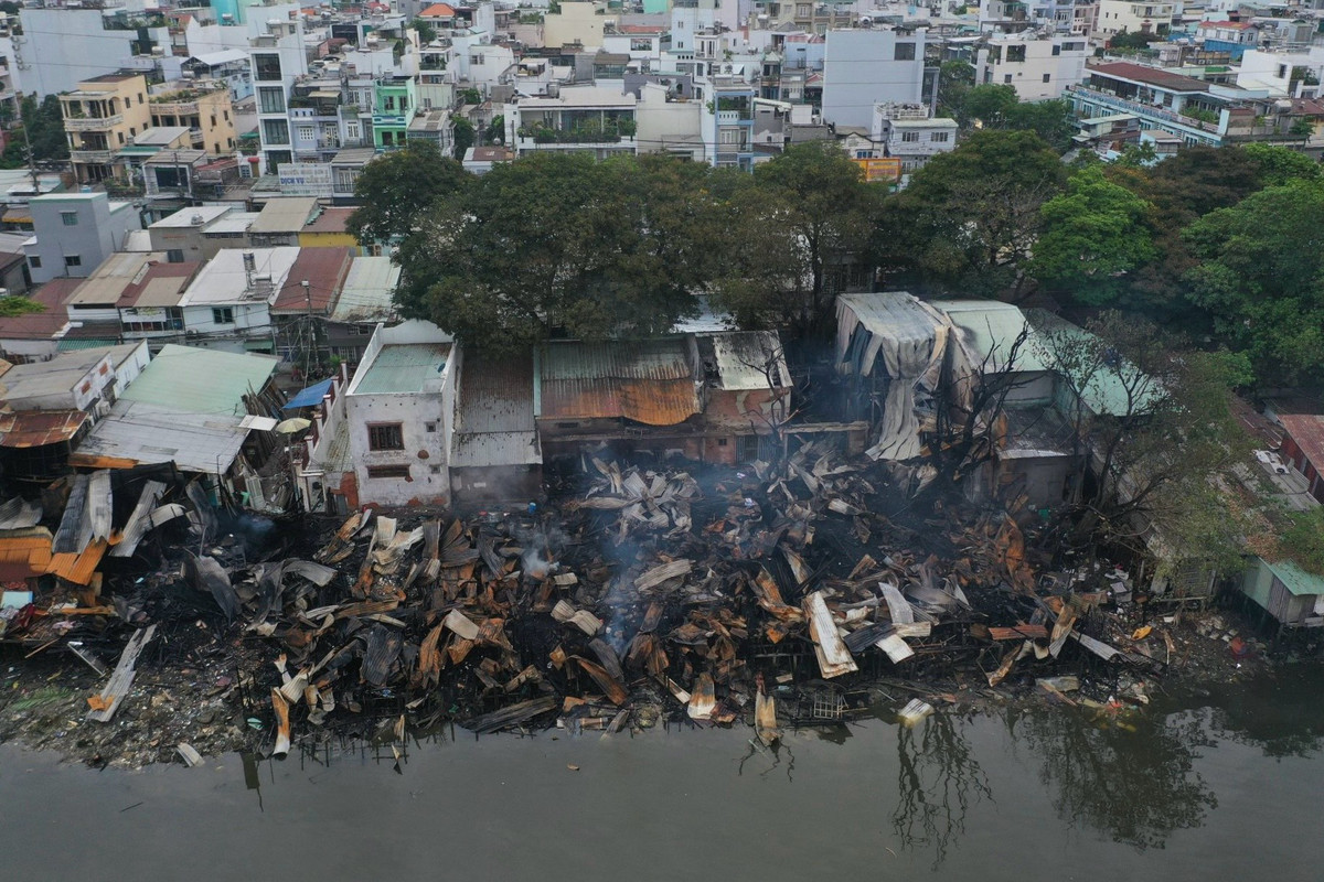 Khói vẫn bốc lên từ hiện trường vụ cháy dãy nhà ven kênh ở TP.HCM.