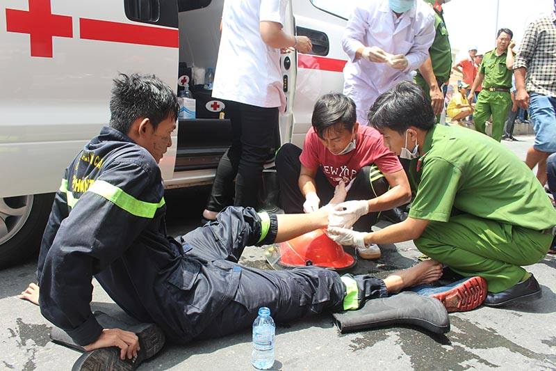 Một số chiến sĩ tham gia chữa cháy bị thương. Rất nhiều xe cứu thương đang có mặt tại hiện trường đám cháy khu công nghiệp Trà Nóc. Một số công nhân đang cố gắng di dời hàng hoá từ bên trong ra ngoài.