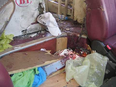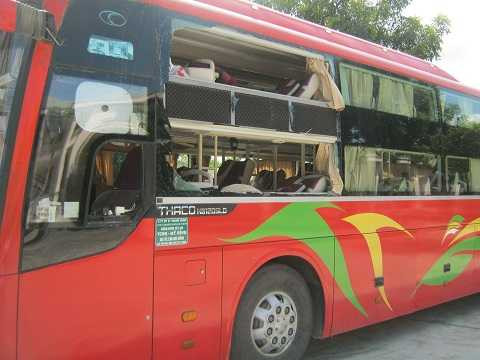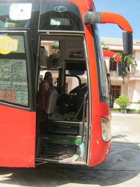 | Phần hông xe kính vỡ nát do hành khách đập để thoát ra ngoài |