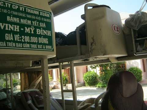 | Thông tin ghi trên xe khách này cho biết, xe mang BKS 29B-05671 của Công ty CP Vận tải Thanh Xuân. Đoàn xe H&N, Tuyến Vinh - Giáp Bát - Mỹ Đình. Khi xe gặp nạn đang trên đường ra Hà Nội. |