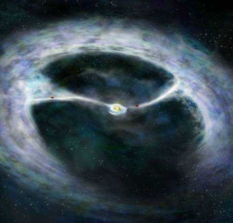 Đĩa bụi và khí khổng lồ nằm cách xa ngôi sao trẻ, tạo thành đám mây bụi di chuyển xung quanh nó. Tuy nhiên, quá trình này xuất hiện những bất thường và lượng khí và bụi đó tiếp tục tạo ra thêm 2 ngôi sao, quay xung quanh ngôi sao trẻ mới được hình thành.
