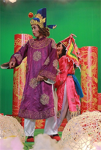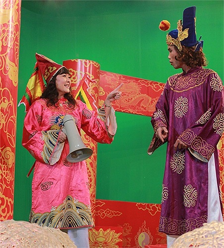 (VTC News) - Danh hài Hiệp Gà tái xuất làm Bắc Đẩu bên cạnh Táo Văn hóa Vân Dung trên sân khấu Táo quân 2012 phiên bản VTC. (ảnh: Dương Triều).