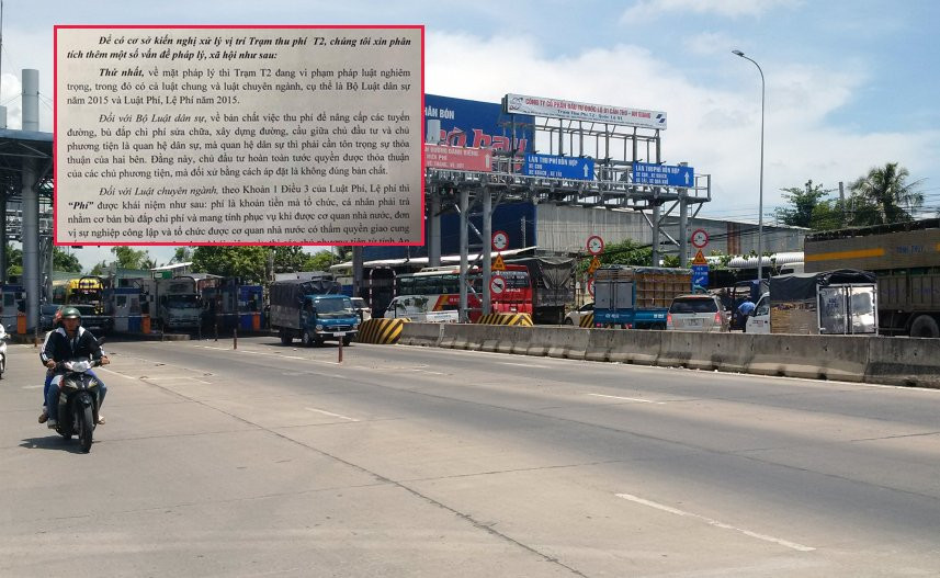 Cũng theo Hiệp hội Vận tải An Giang, về mặt pháp lý, trạm T2 đang vi phạm pháp luật nghiêm trọng như Luật Dân sự, Luật phí, Luật Lệ phí. Về mặt xã hội, nếu duy trì đặt trạm T2 thì chắc chắn sẽ xảy ra mâu thuẫn xã hội nghiêm trọng và có khả năng gây mất trật tự an ninh khu vực.