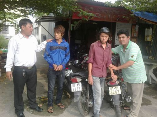 | Anh Tân (ngoài cùng, bên trái) và đồng đội vừa bắt hai tên trộm xe ở Bình Dương vào ngày 8-4 |
