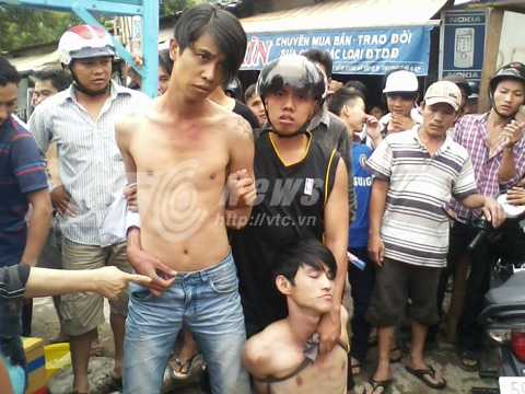 | Hai tên cướp bị "hiệp sĩ" Vũ Trần Quyết khống chế. Ảnh: Phan Cường |
