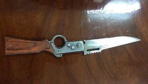 | Con dao bấm tên Khôi dùng đâm chém hiệp sỹ Minh Tiến và uy hiếp người đi đường nhằm cướp xe máy tẩu thoát. Ảnh: Phan Cường |