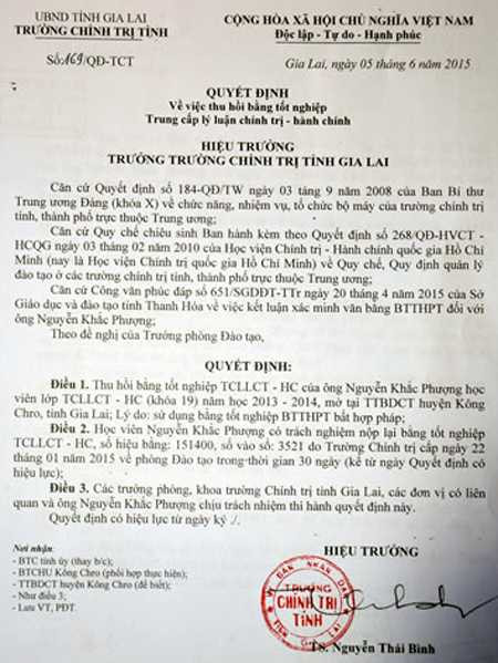 Quyết định thu hồi bằng trung cấp chính trị đối với hiệu phó dùng bằng giả