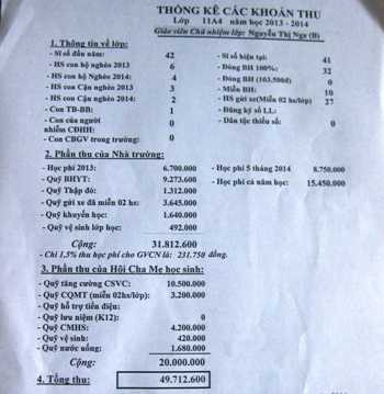 Cụ thể năm học 2013-2014 thông qua hội cha mẹ học sinh, nhà trường đã đưa ra nhiều khoản thu bất hợp lý như: Quỹ tăng cường cơ sở vật chất 200.000 đồng/học sinh/năm; Quỹ cảnh quan môi trường 80.000 đồng/học sinh/năm; Quà lưu niệm cho khối 12 là 100.000 đồng/học sinh/năm; Quỹ vệ sinh 10.000 đồng/học sinh/năm.