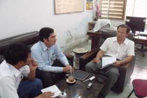Hiệu trưởng trường THCS Lê Lai (áo trắng) và Phó Chủ tịch UBND phường 15 -quận 8 Trần Hữu Thuận tại buổi tiếp xúc với PV sáng 31/3 (Ảnh: N.D)