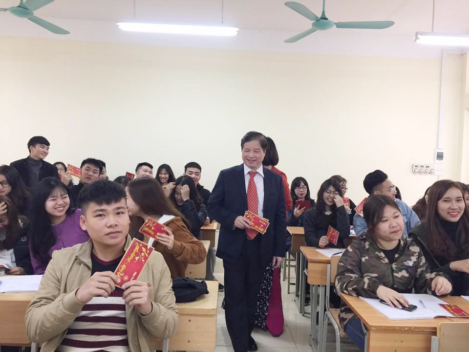 GS.TS Phạm Quang Trung đến tận lớp chúc Tết và lì xì từng sinh viên. (Ảnh: Lê Loan)