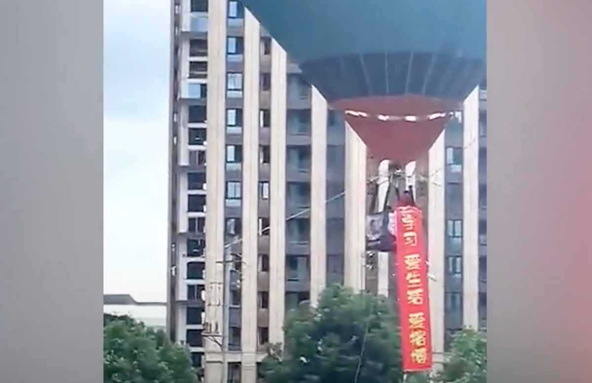 Hiệu trưởng đứng trên khinh khí cầu chúc mừng lễ khai giảng ở Trung Quốc