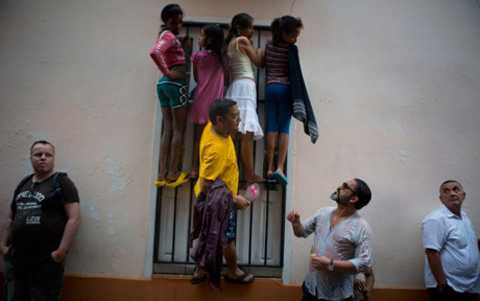 | Người dân Cuba leo lên hành lang, cửa sổ để nhìn đoàn xe của Tổng thống Mỹ đi qua |