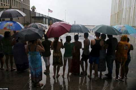 | Người dân Cuba đứng chờ bên ngoài Đại sứ quán Mỹ tại La Habana lúc Tổng thống Obama tới. |