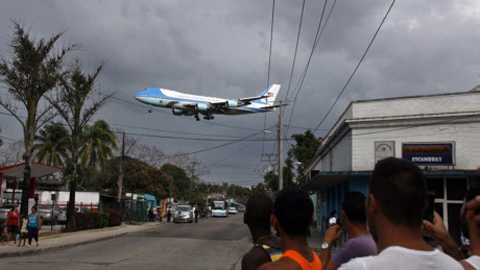 | Người dân Cuba tụ tập ngoài đường dõi theo chiếc Không Lực Một nổi tiếng chở Tổng thống Obama sắp đáp xuống sân bay Jose Marti |