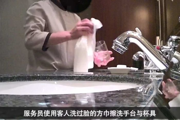 Theo đó, khách sạn The Ritz-Cartlon ở Thượng Hải, Trung Quốc là khách sạn hạng sang có giá phòng rất cao. Tuy nhiên, camera bí mật được giấu trong phòng cho thấy nhân viên dọn phòng dùng những chiếc khăn để vừa lau bồn rửa, kệ để đồ vừa lau cốc uống cà phê của khách. Đoạn video còn tiết lộ hình ảnh một phụ nữ lau dọn trong khách sạn Four Seasons ở Thượng Hải cũng dùng một tấm bọt biển để lau vòi tắm, kệ để đồ và cốc trong nhà vệ sinh.