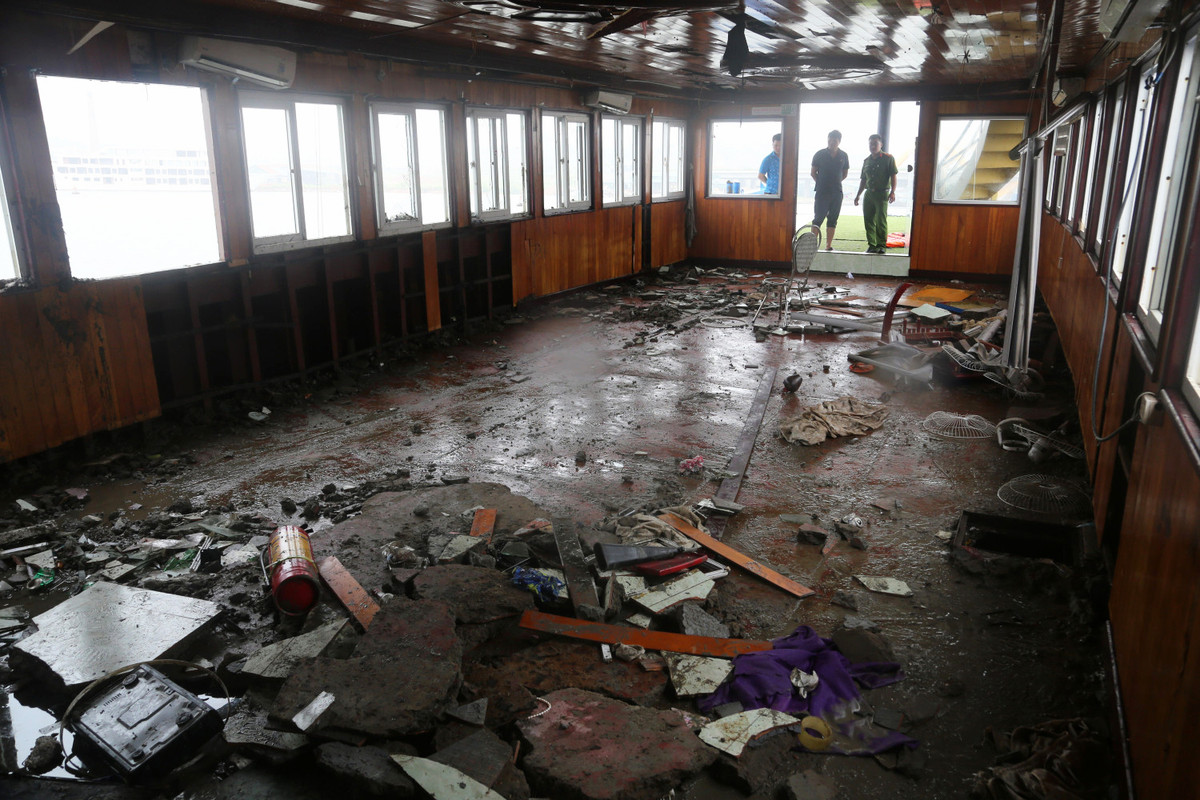 Khung cảnh xác xơ bên trong khoang tàu sau khi bị dông đánh lật úp vào chiều 19/7. Nhiều tài sản và bàn ghế trên tàu bị nước biển cuốn trôi. (Ảnh: Nguyễn Khánh)