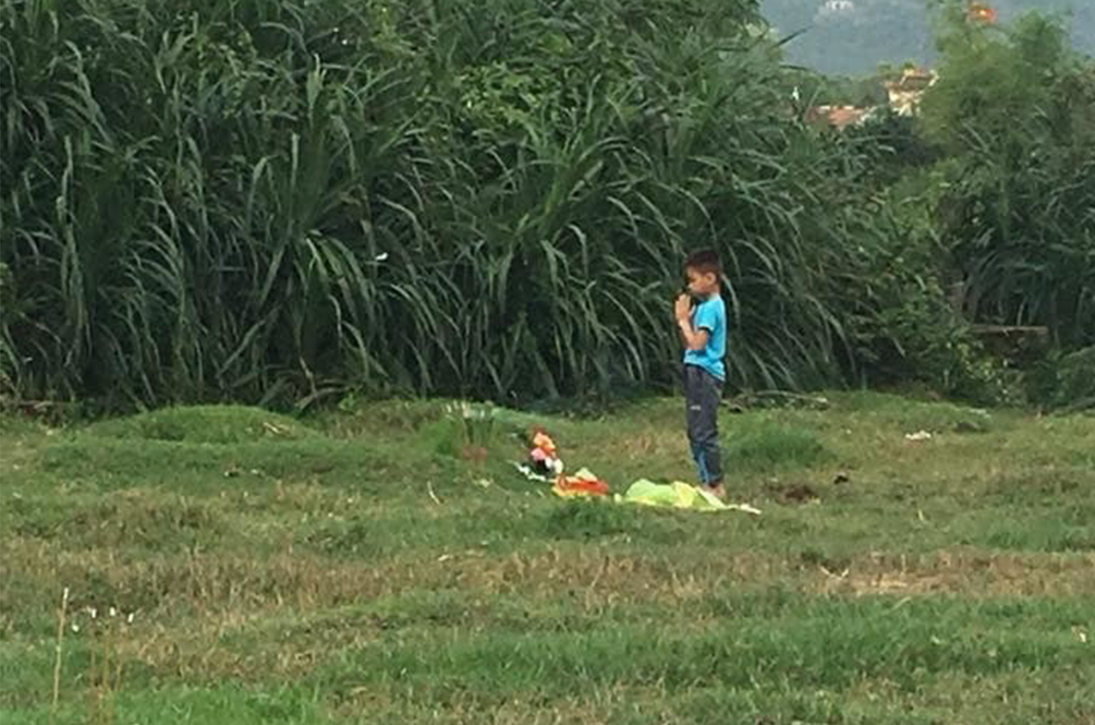 Qua bức ảnh có thể thấy cậu bé chỉ có một mình, dưới chân là ít vật phẩm cúng như hương hoa, giấy tiền vàng bạc. Cậu bé đứng đó lặng lẽ chắp tay như thầm cầu nguyện gì đó trước ngôi mộ đã xanh cỏ.