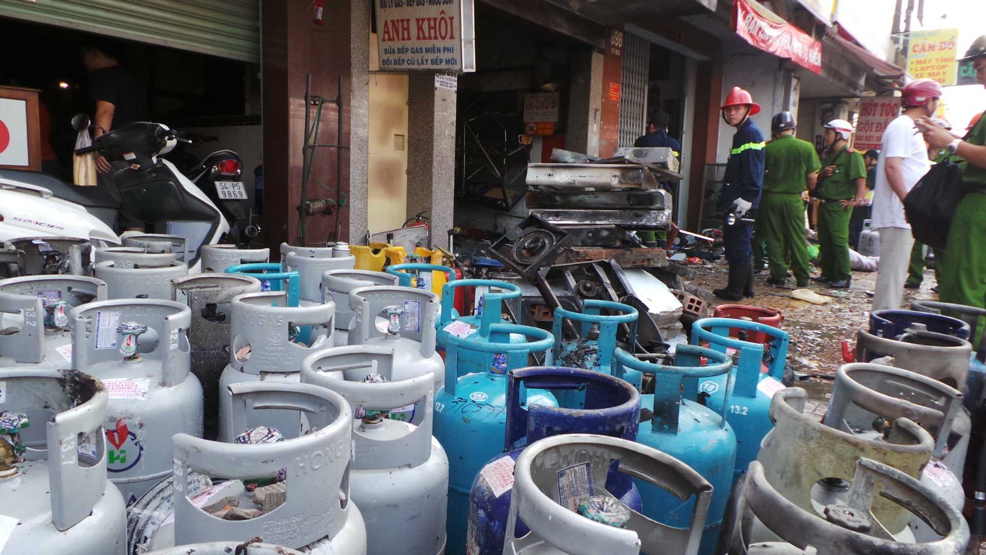 Tại hiện trường, căn nhà ba tầng bị cháy sém, riêng tầng triệt nơi làm đại lý gas bị cháy rụi, đổ sập. Rất may lính cứu hoả kịp thời di chuyển hàng trăm bình gas lớn nhỏ ra bên ngoài. Một số bình gas loại 12kg bị bung van, xì gas buộc lực lượng chức năng phải dùng hoá chất, băng kéo dán chặn lại.