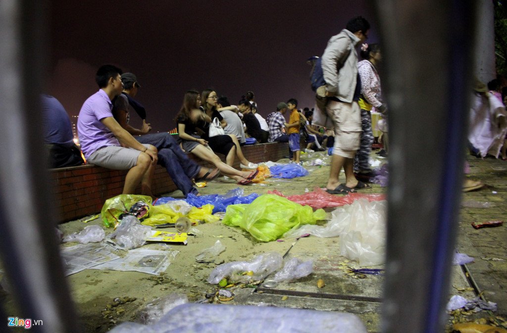 Người dân và du khách tập trung thành nhiều nhóm nhỏ, cùng nhau trải bạt, mang theo thức ăn và nước uống đến dọc các công viên, chọn vị trí thuận lợi để xem bắn pháo hoa. Tuy nhiên, khi đội thi đầu tiên vừa kết thúc màn trình, cũng là lúc những túi rác lớn xuất hiện dọc các con đường vào công viên và ven các tuyến đường có đông người tập trung.