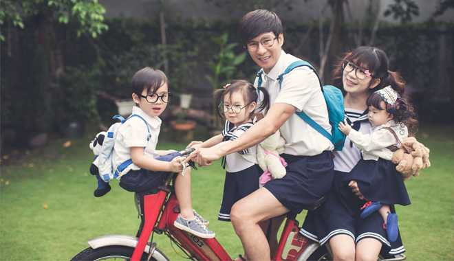 Mới đây, gia đình nam ca sĩ "Trọn đời bên em" vừa thực hiện bộ ảnh ngộ nghĩnh khi anh và vợ cùng hóa thân thành những người bạn học, cùng cắp sách đến trường với ba thiên thần nhí đáng yêu.