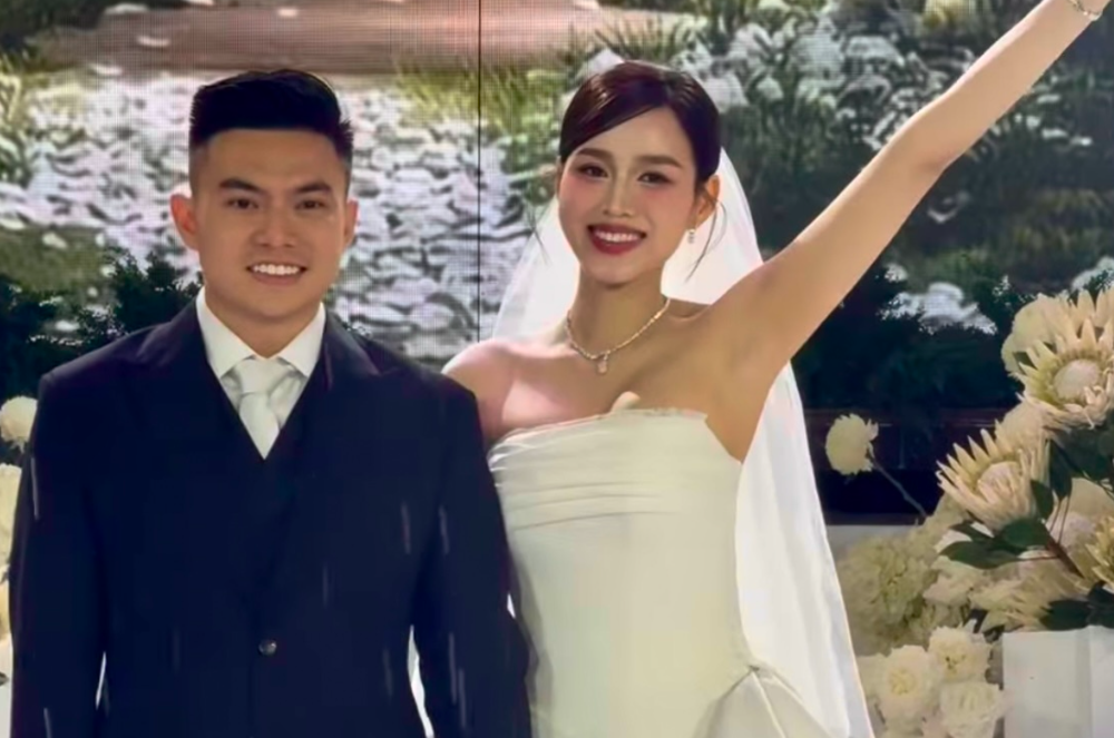 Trong buổi lễ, Hoa hậu Đỗ Thị Hà diện váy cưới trắng trễ vai thanh lịch, hạnh phúc, nở nụ cười tươi rạng rỡ. Chú rể mặc vest đen lịch lãm, nắm chặt tay vợ giữa không gian lãng mạn và ánh sáng dịu nhẹ.