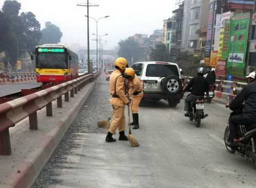 Cảnh sát giao thông quét đường trên cầu vượt Ngã Tư Vọng do đá, cát đổ trên đường giúp người dân đi tránh tai nạn.